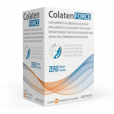 O que é o Suplemento Alimentar Colaten Force? O Colaten Force é um suplemento alimentar em comprimidos, moderno e completo, que contém colágeno Tipo II não desnaturado, Ácido Hialurônico e Metilsulfonilmetano (MSM). Como tomar o Suplemento Alimentar Colaten Force? Recomenda-se ingerir 1 a 2 comprimidos ao dia, ou conforme orientação do médico e/ou nutricionista. Composição Ácido Hialurônico, Colágeno Tipo II não desnaturado e Metilsulfonilmetano (MSM). Não contém açúcar e lactose.. Advertências Uso oral. Uso adulto. Este produto não é um medicamento. Não exceder a recomendação diária de consumo indicada na embalagem. Mantenha fora do alcance das crianças. Conservar este produto em local seco e fresco, ao abrigo da luz e umidade.